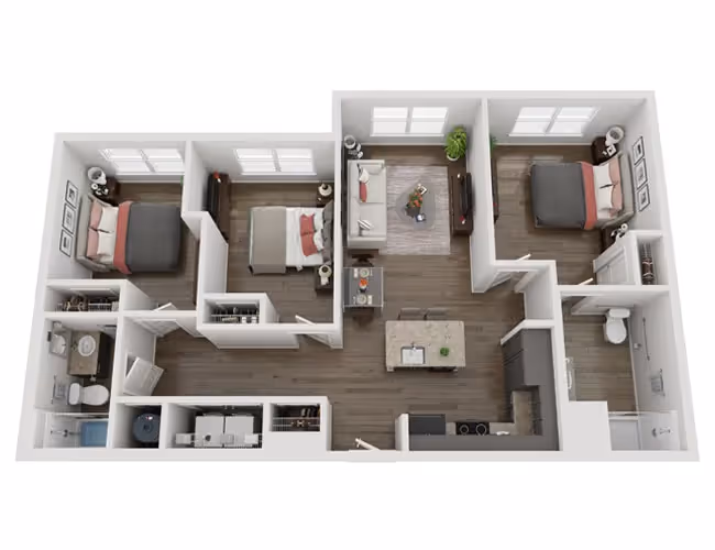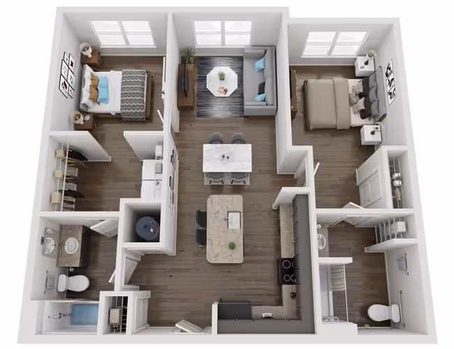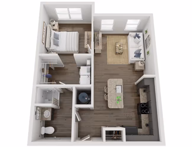 Find the perfect space to call home with our thoughtfully designed floor plans. Each apartment at Symphony is bright, spacious, and tailored for modern living. Enjoy open-concept layouts, wood-inspired flooring, and black appliances.
